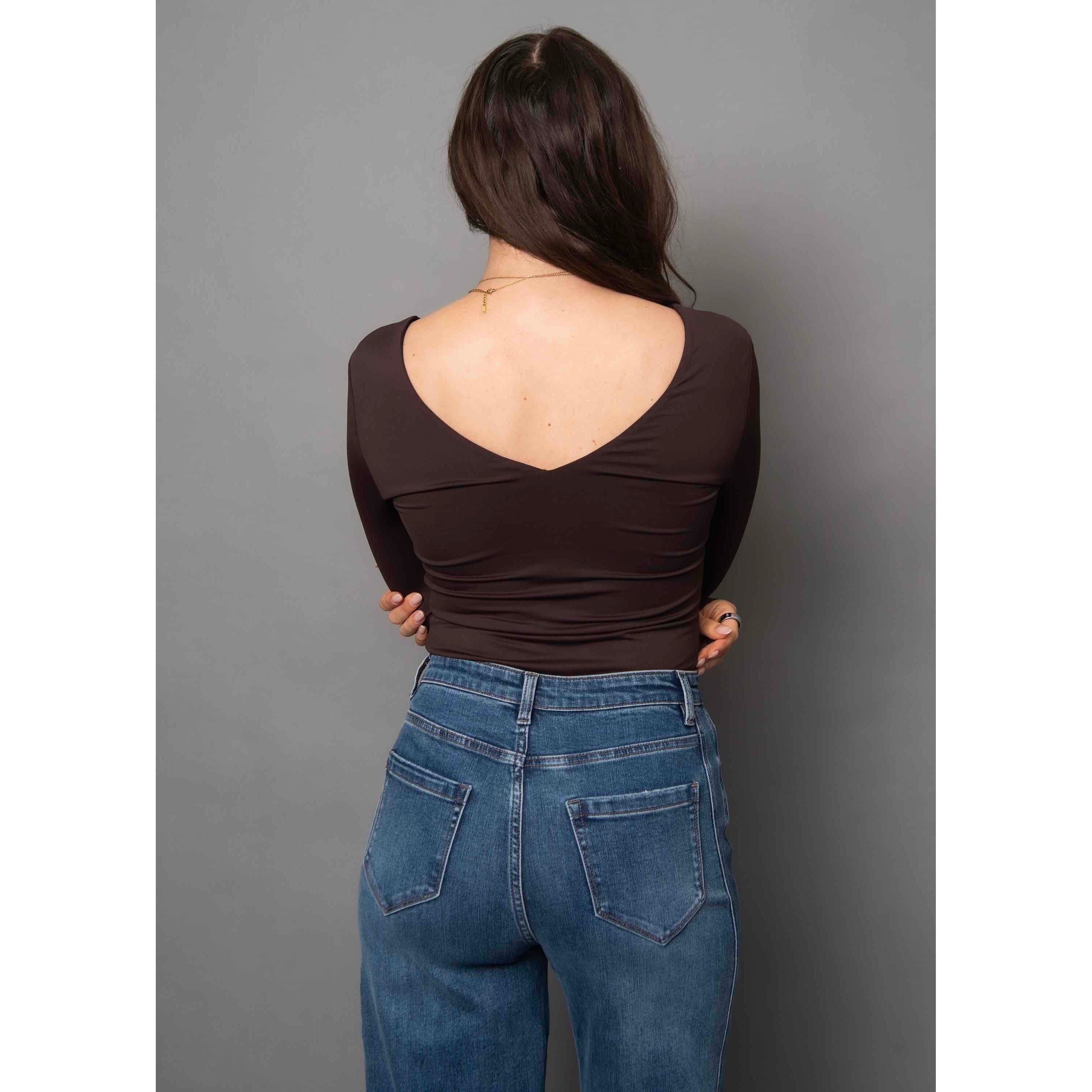 Slip into the Second Skin Valentina LS Double V-Neck Top for a bold, sleek look that hugs every curve with its stretchy fabric. Featuring a unique double V neckline and long sleeves, this top adds an edgy twist to your layering game, making it perfect for standing out effortlessly.