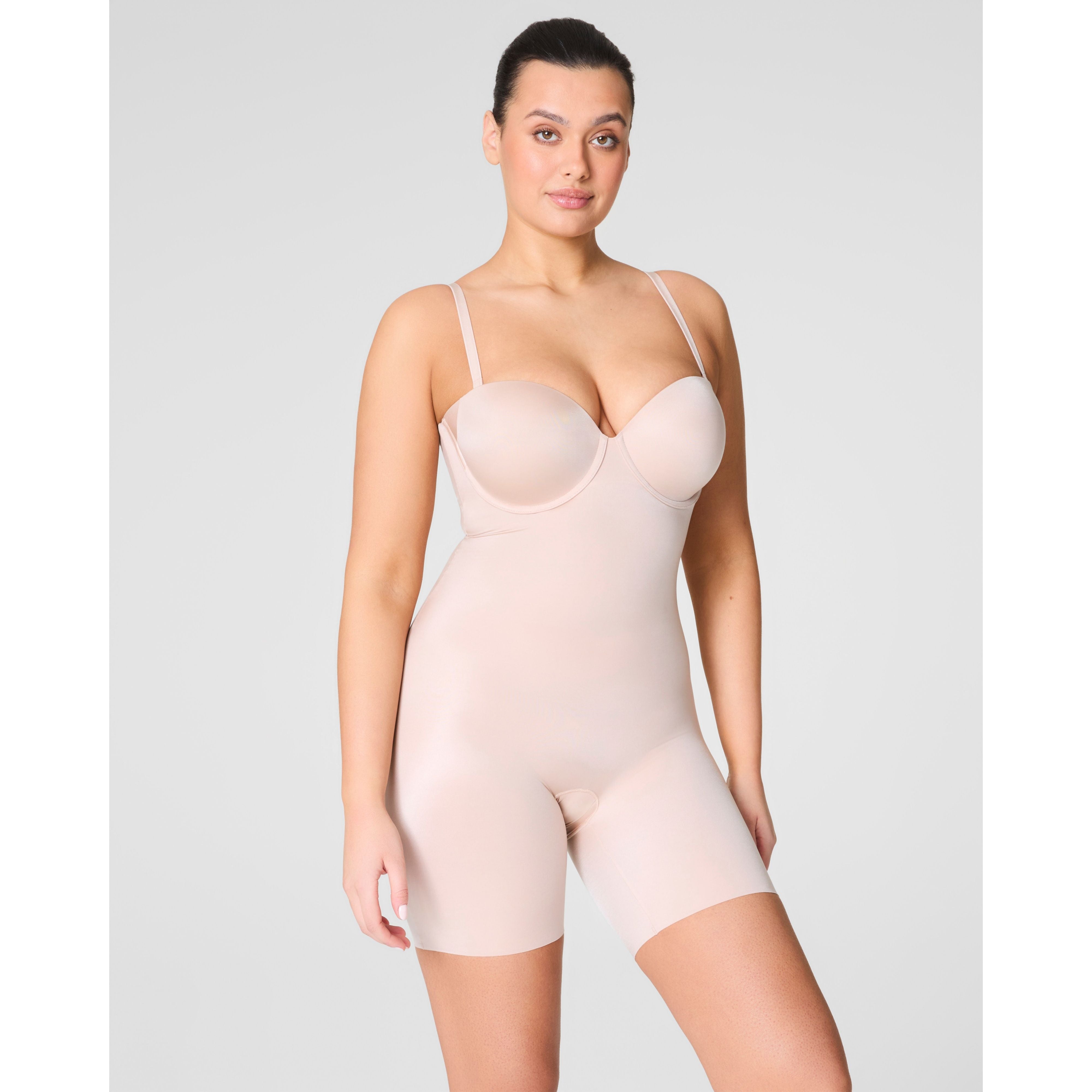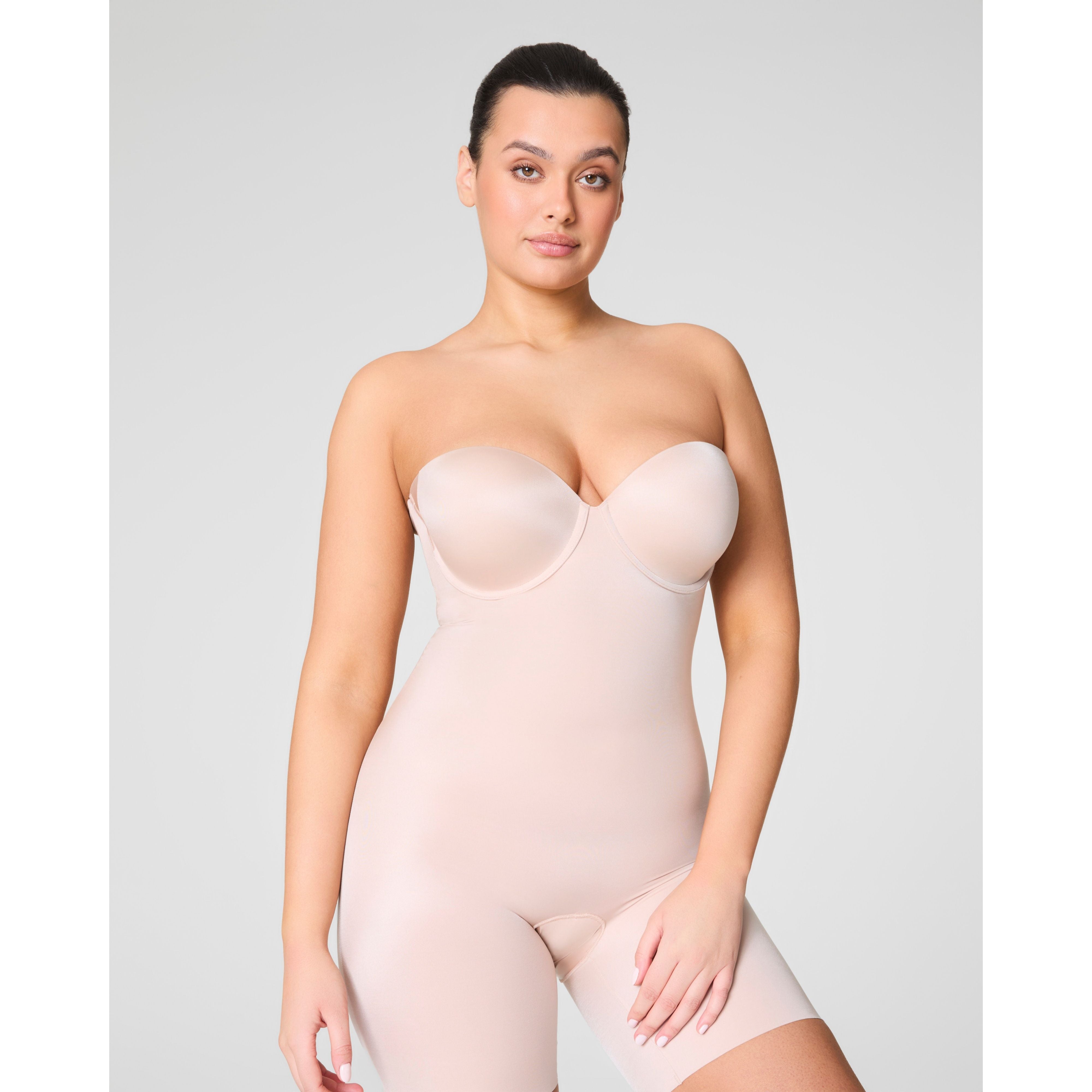 Our strapless mid-thigh bodysuit provides all-over compression to shape and support your figure. With fit-flexible and lightly padded cups that serve as your bra, removeable and 5-way convertible straps that eliminate rolling and folding, and free-cut hems that don't squeeze or dig, this will be your go-to, versatile bodysuit for those very specific silhouettes that require very specific shapewear. Crafted from lightweight and cling-free fabric that prevents thigh chafing, it's perfect for all-night wear.